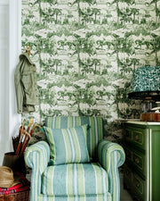 Saddle up for the race of your life with the GRAND PRIX, a wallpaper drawing influence from French Toile de Jouy pattern with a sporty, equine twist. Don your jewels and finery head to the racecourse – join the spirited crowd, converse with the jockey, find a lucky horse shoe, or place a bet or two in this lively illustrative print, where the hand drawn merges true to life realism with a satirical, cartoon-esque character. Printed in a single colour, choose from either a soft green which heightens the leafy, rural setting or rich red on a warm backdrop for a taste of traditional English country life.