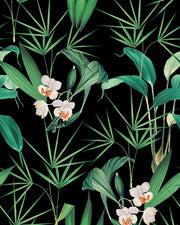 A lush arrangement of a tropical foliage, on a black background, inspired by the exotic gardens in Palm Spring.