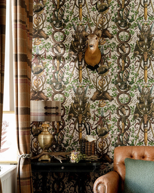 DescriptionMajestic beasts abound on this bold wallpaper design where handsome stags and athletic mountain dogs are bound together by a tapestry o...