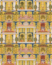 Set against a bold yellow backdrop, a sensory indulgence awaits as you immerse yourselfin ornate architecture decorated with statement foliage and bold colours while pastel pink roofs bring a calm contrast to the intricacy of the MARJORELLE GARDEN print. Delicate purple flowers cascade around the architectural columns as a central golden canopy offers an elegant shady retreat from the warm African sun. A bold and captivating print named after the celebrated garden in Marrakech, this wallpaper is perfect for a maximalist home.