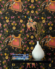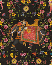 An amazing artwork on a black background, inspired by the traditional Indian fabric.